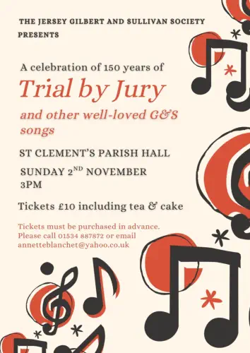 The inspiration behind the concert is to mark the 150th anniversary of the first performance (in 1875) of Trial By Jury - which was the first of the collaborations between Gilbert and Sullivan. The second half of the concert will therefore involve a performance of that operetta. In the first half, there will be selection of solos, ensembles and choruses from the other works of the duo. After a couple of productions away from the works of Gilbert and Sullivan, the concert represents a return to those works, for the celebration of which the Society was formed. The concert will be at St. Clement's Parish Hall, starting at 3:00pm. During the interval, tea and cake will be available.
